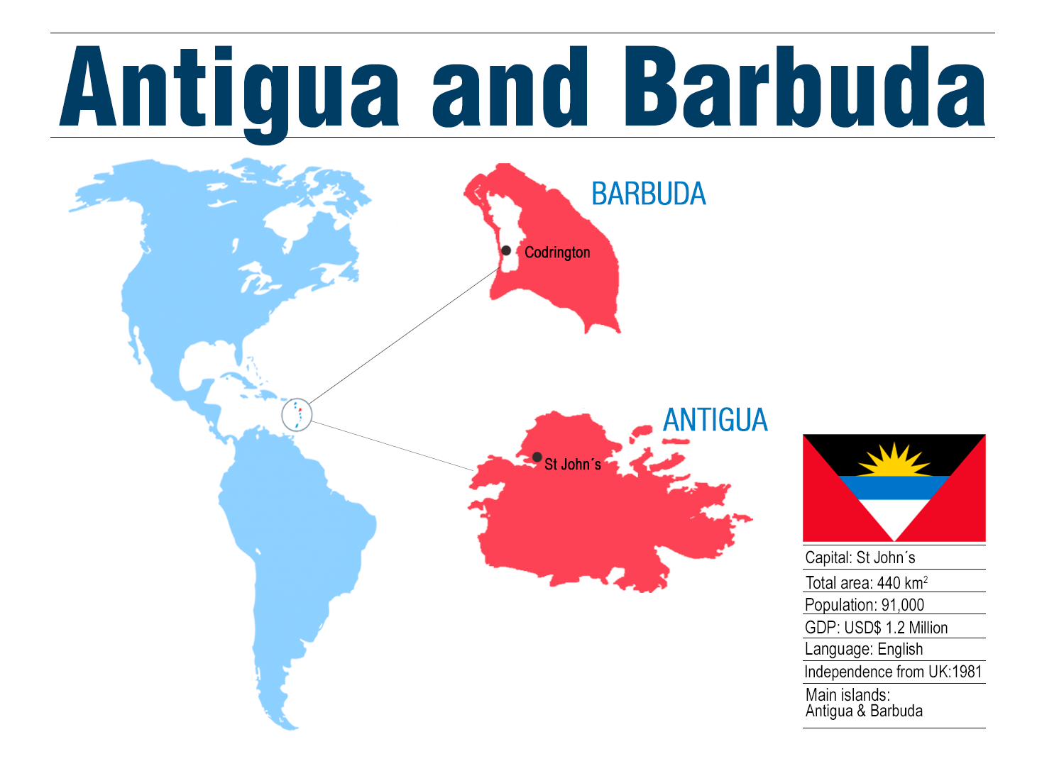 Antigua and Barbuda are two islands in the Caribbean, only 32 miles apart; together they form a Federation of 91 thousand inhabitants, with St. John’s as their capital. Tourism is the Federation’s main economic activity, since their beaches are recognized among the most famous in the world.